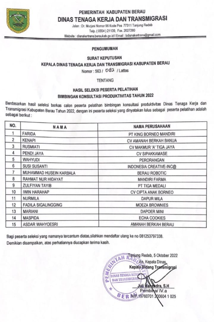 Sehubungan dengan diadakannya seleksi pelatihan bimbingan konsultasi produktivitas yang telah dilaksanakan awal oktober 2022 kemaren, maka dikeluarkannya hasil seleksi peserta bimbingan konsultasi produktivitas tahun 2022 dengan surat nomor : 563/082/Lattas Pelatihan pada tanggal 05 Oktober 2022 dengan hasil 15 perusahaan yang dinyatakan memenuhi/mendekati kriteria perusahaan kecil. Dengan ini Dinas Tenaga Kerja dan Transmigrasi Kabupaten Berau mengadakan "PELATIHAN PELATIHAN BIMBINGAN KONSULTASI PRODUKTIVITAS TAHUN 2022" yang dibuka tanggal 13 oktober 2022 pada Kantor Dinas tenaga Kerja dan Transmigrasi Kabupaten Berau Ruang Meeting Lantai 3. Kegiatan ini merupakan program pelatihan 12 Jam Pelajaran yang dilaksanakan selama selama 2 (Dua) hari mulai tanggal 13 Oktober 2022 sampai dengan 14 Oktober 2022