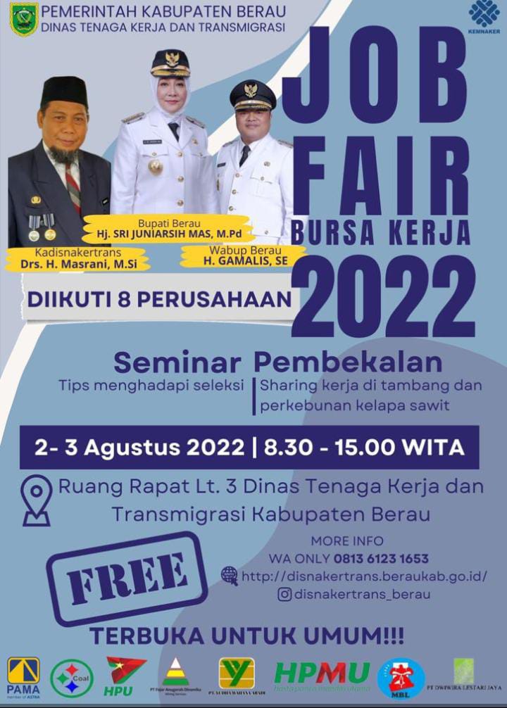 Dinas Tenaga Kerja dan Transmigrasi berhasil menyelenggarakan "JOB FAIR ATAU BURSA KERJA" sebagai kegiatan yang mempertemukan pemberi kerja dan pencari kerja. Acara pembukaan kegiatan Job Fair/ Bursa Kerja ini dilaksanakan tanggal 2 Agustus 2022 di Kantor Dinas Tenaga Kerja dan transmigrasi Kabupaten Berau Ruang Meeting Lantai 3.