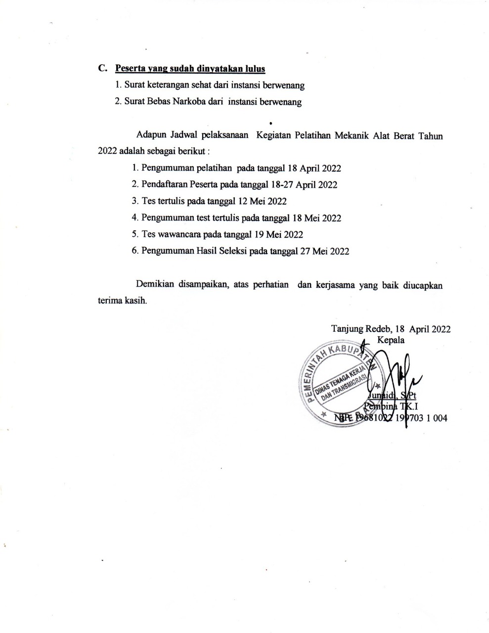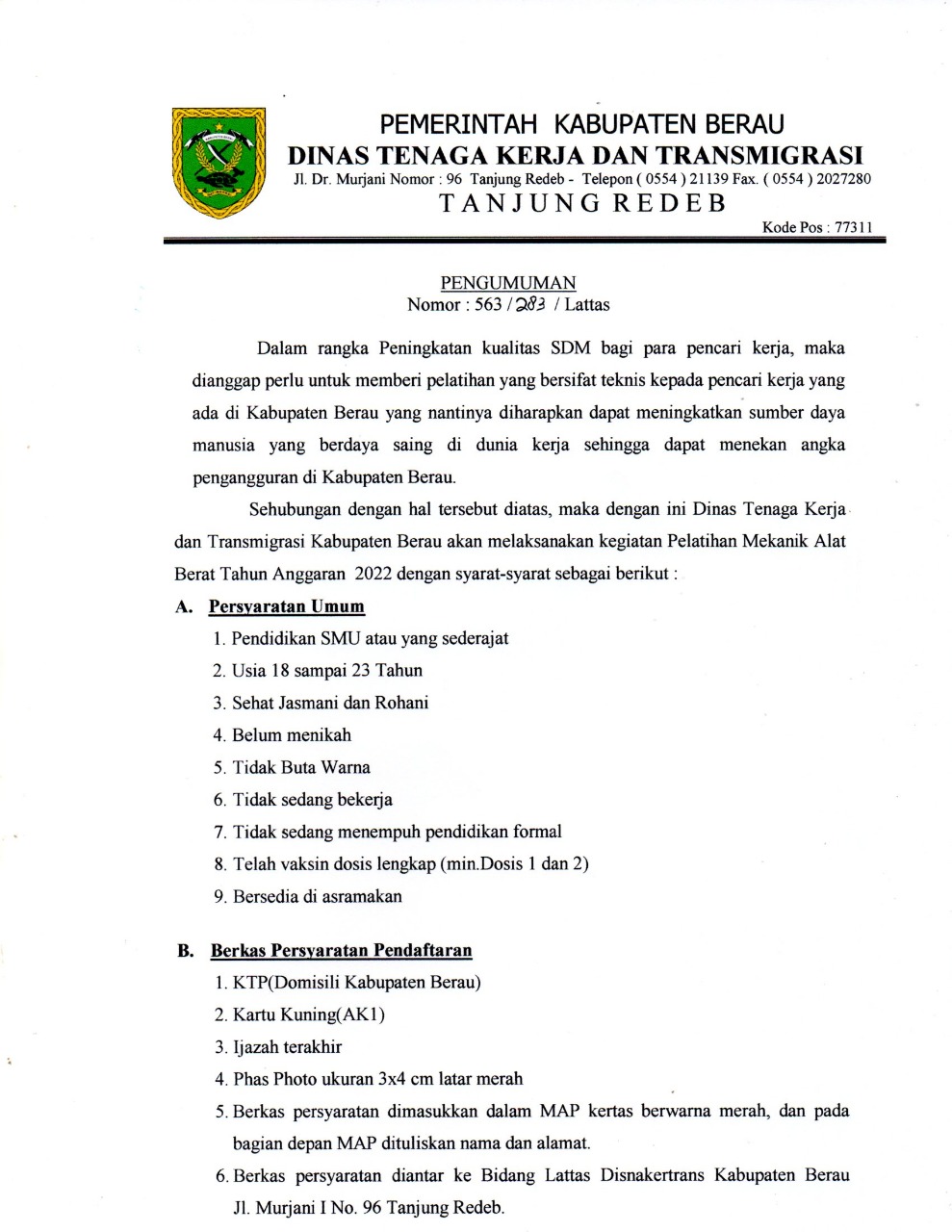Sesuai dengan Jadwal pelaksanaan program Pelatihan Mekanik Alat Berat Tahun 2022 yang sebelumnya telah disebarluaskan melalui media Sosial, Papan Pengumuman Disnakertrans Kabupaten Berau dan Website Resmi Disnakertrans Kabupaten Berau " disnakertrans.beraukab.go.id ", maka pada tanggal 14 Mei 2022 Dinas Tenaga Kerja dan Transmigrasi Kabupaten Berau melaksanakan Seleksi secara tertulis yang dilanjutkan wawancara pada Ruang Pertemuan Lantai 3 Disnakertrans Kab Berau.